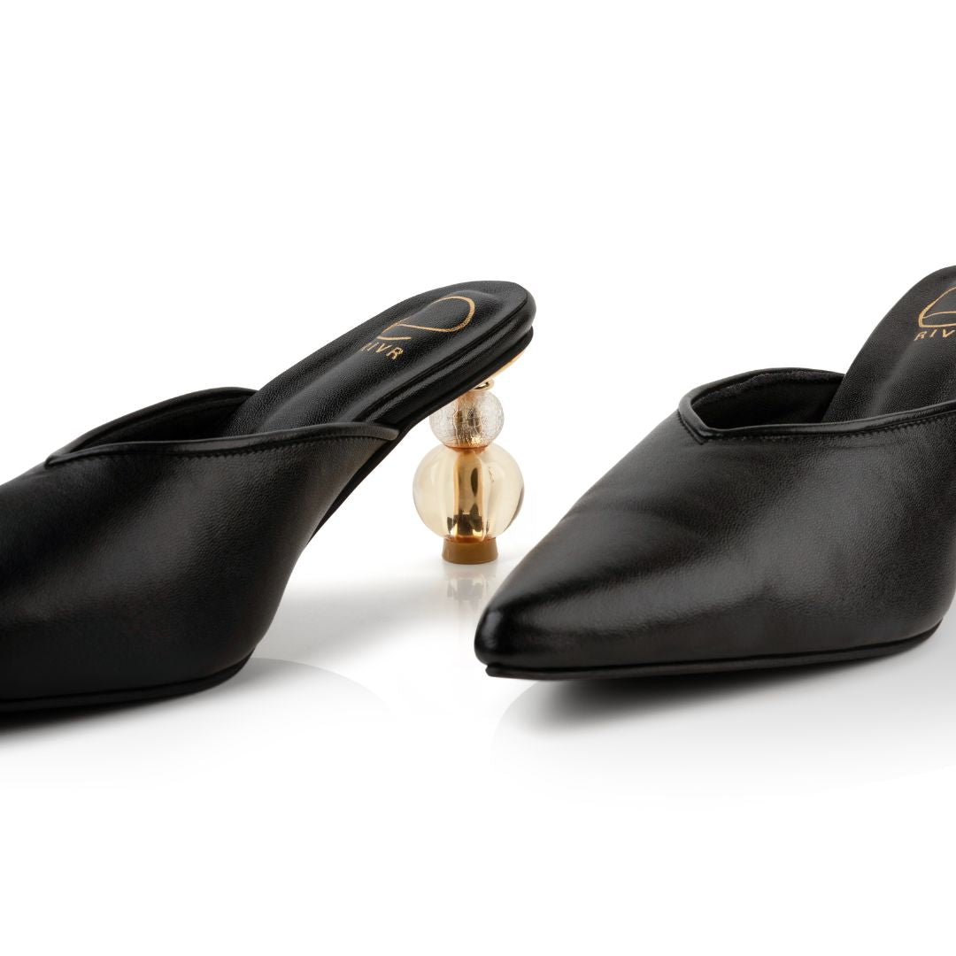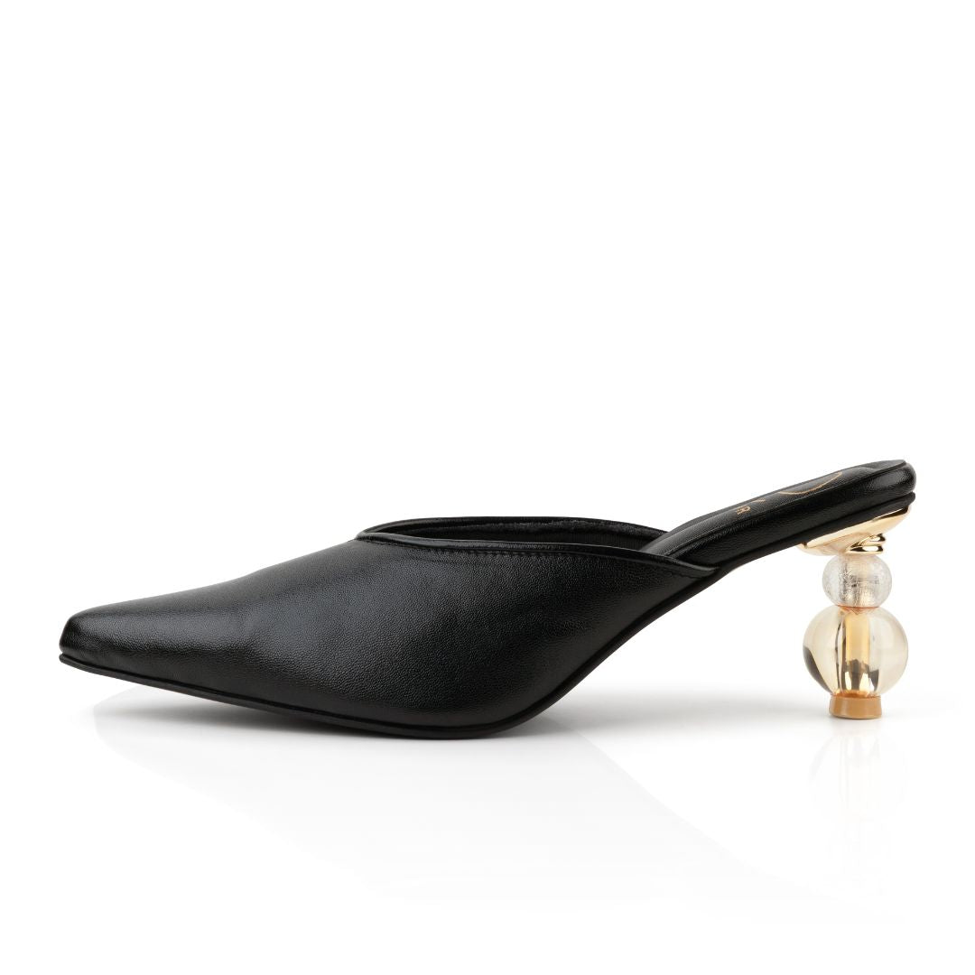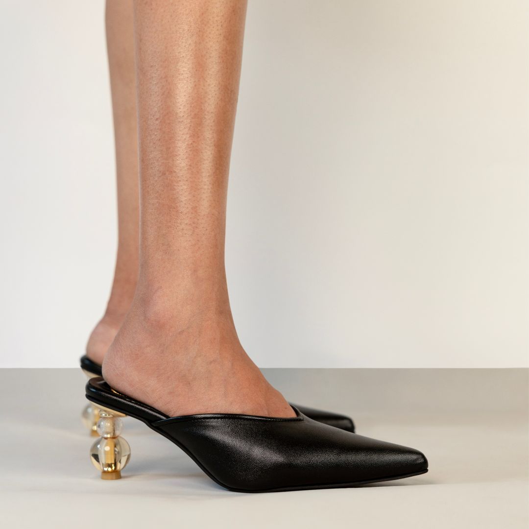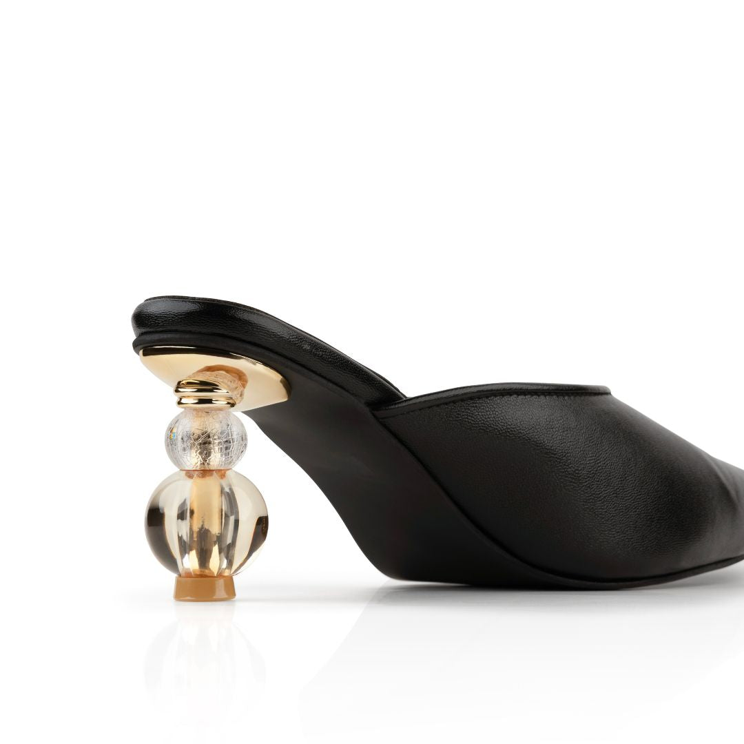 Part of the Form series, A sculptural statement in motion, this sleek black mule features a sharp pointed toe and our signature spherical heel in glass and gold, balancing elegance with bold modernity.