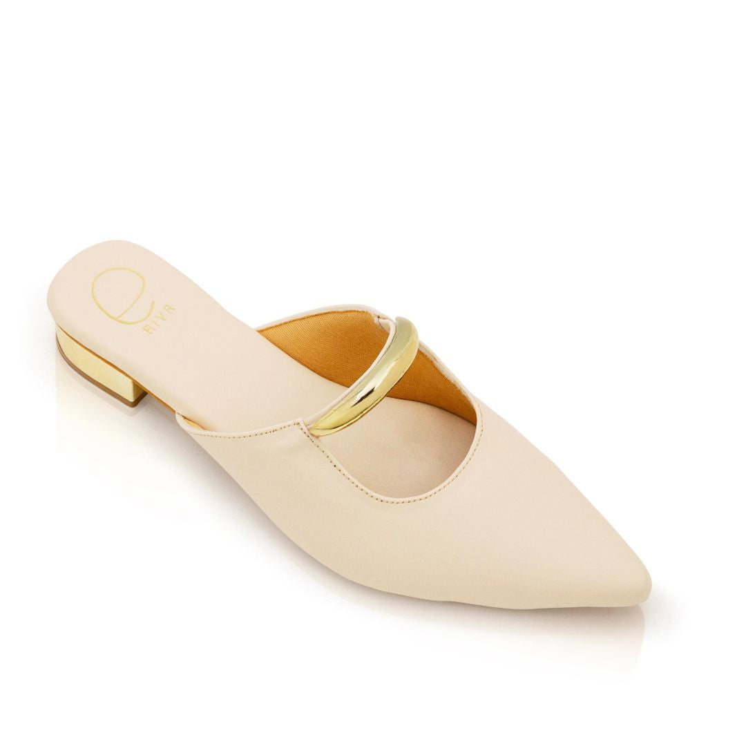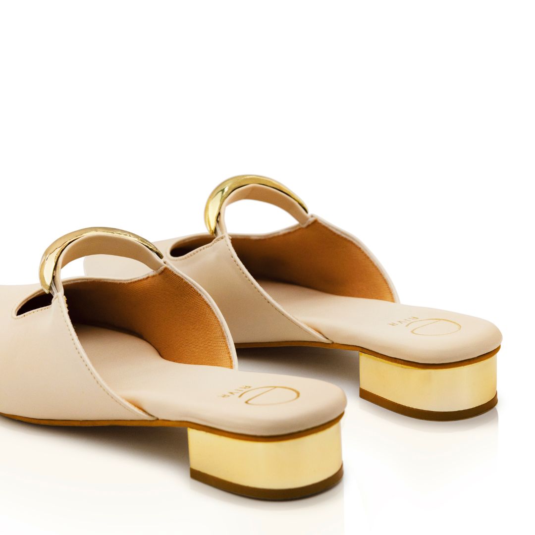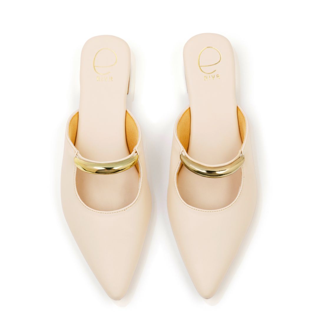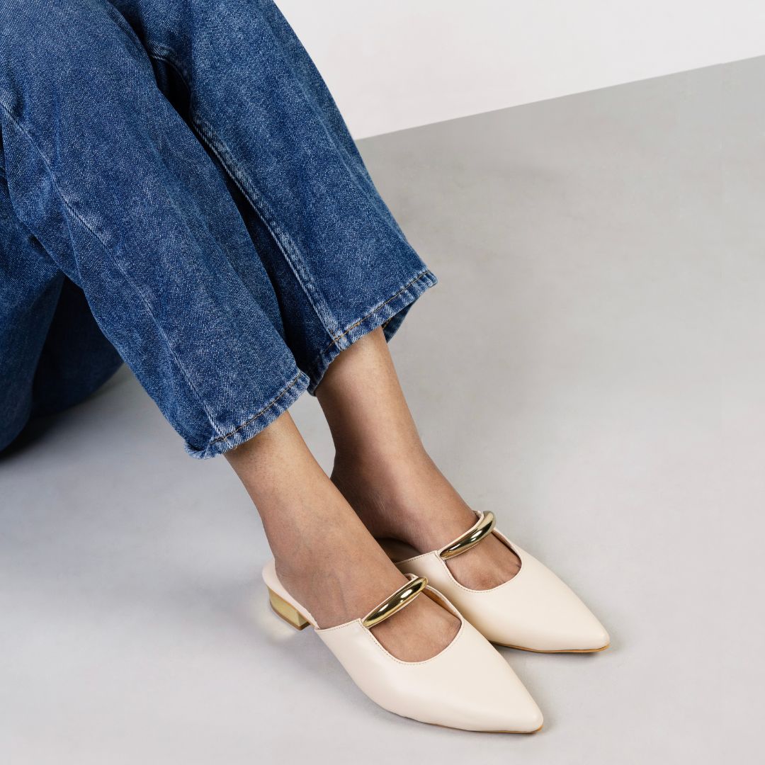 Meet Dawn - This pair is a sleek and modern mule with a sharp pointed toe in Cream. It features a striking sculptural detail: a bold, metallic gold circular accent that arches over the upper, almost like a piece of jewellery built into the shoe.