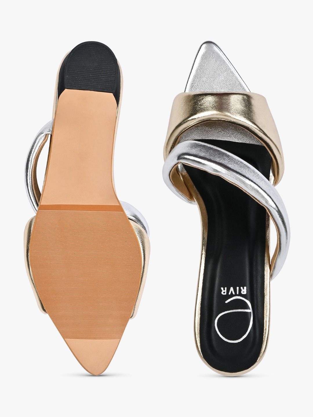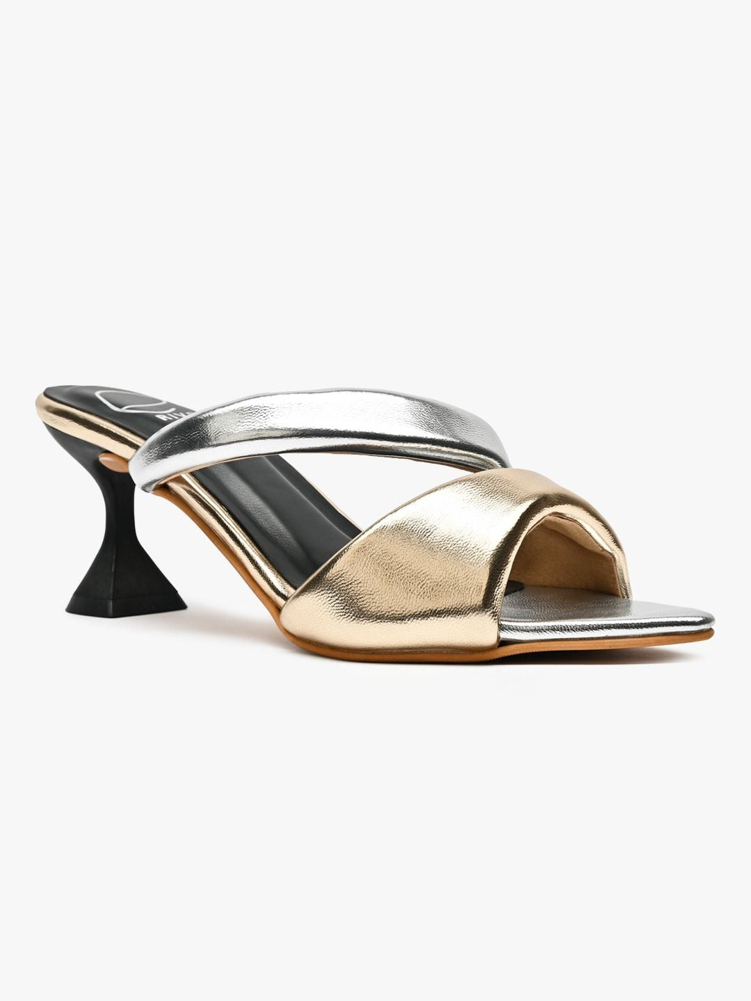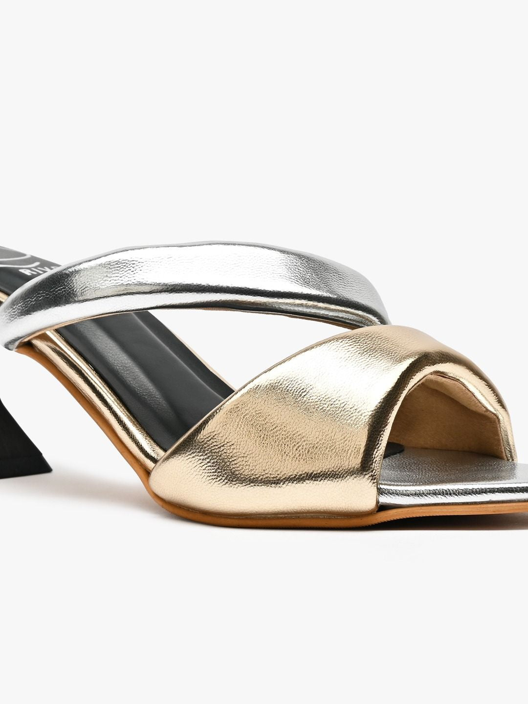 Crafted from metallic vegan leather, these sandals feature an open toe, two Sliver and Gold contrasting straps with a black heel.
