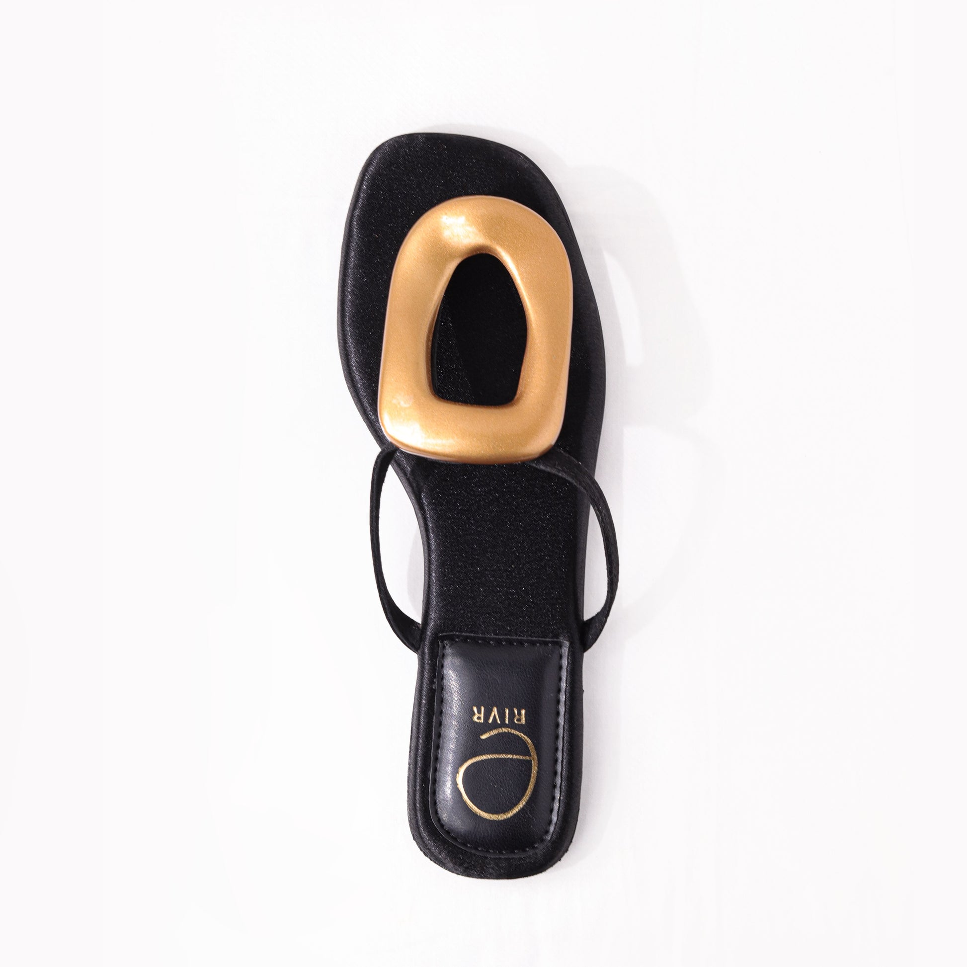 This stylish black sandal features a unique gold geometric accent on the strap, offering a chic and modern design. The squared toe and minimalist silhouette ensure both comfort and elegance, making it perfect for both casual and formal occasions. Upper - PU Synthetic ; Sole - Sole Sheet. With cushioning for extra comfort.
