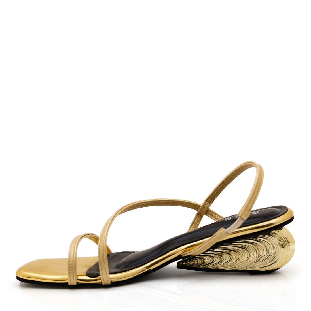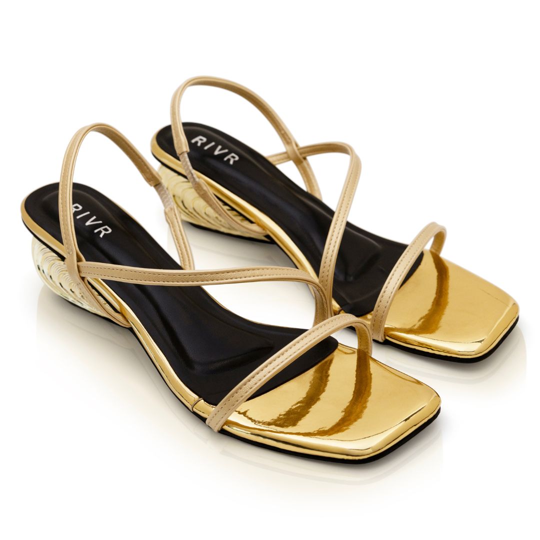 Meet Golden Hour - part of our end-of-summer collection. With its sculpted, swirly golden heel and sleek, minimal straps, this sandal is a true conversation starter. In parallel with other RIVR styles, this pair blends effortless ease with chic boldness perfect for when you want to stand out, but still keep it classy.