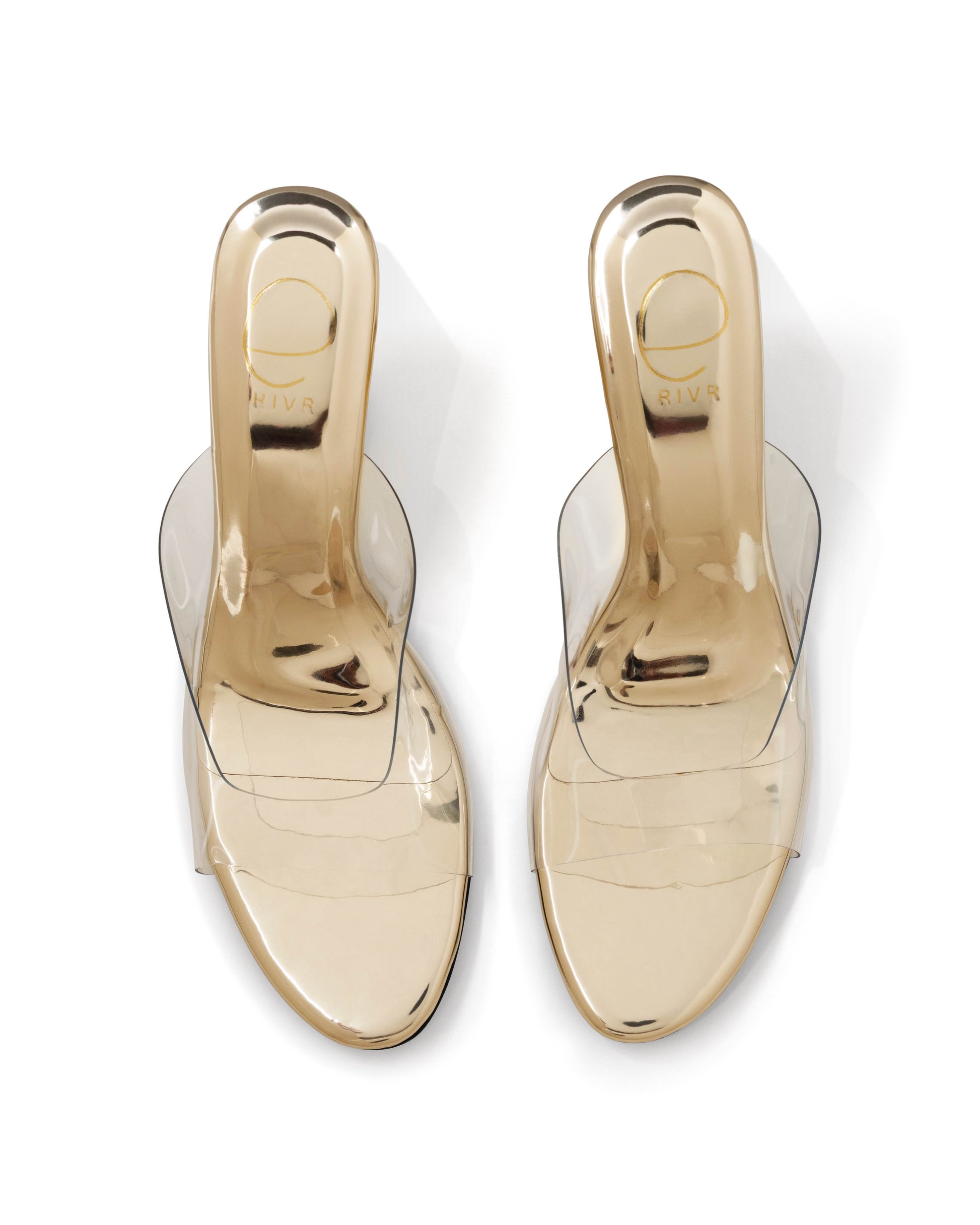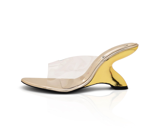 These sculptural heels feature a gravity-defying silhouette, plated in luminous gold, and finished with a crystal-clear upper strap for a barely-there effect.