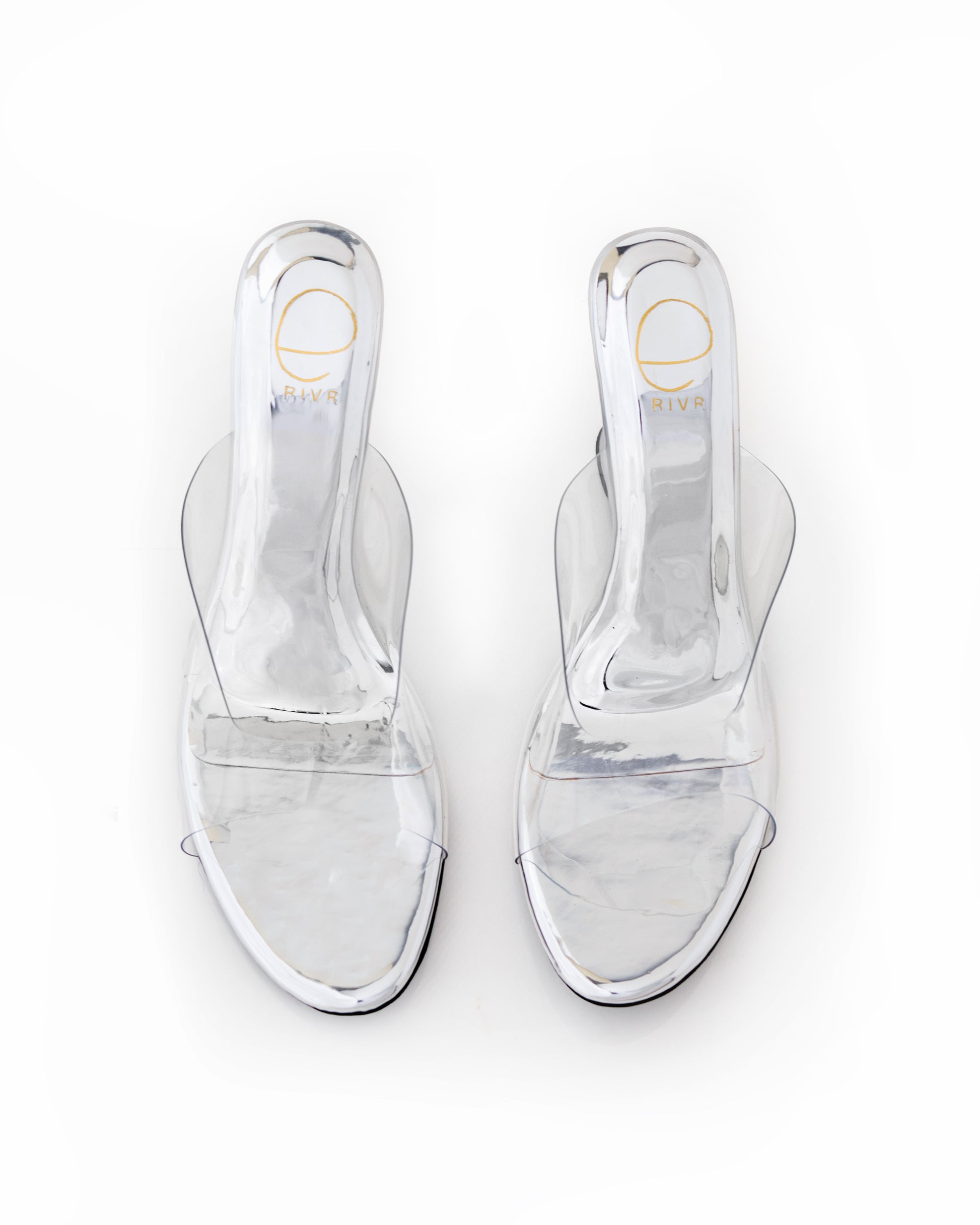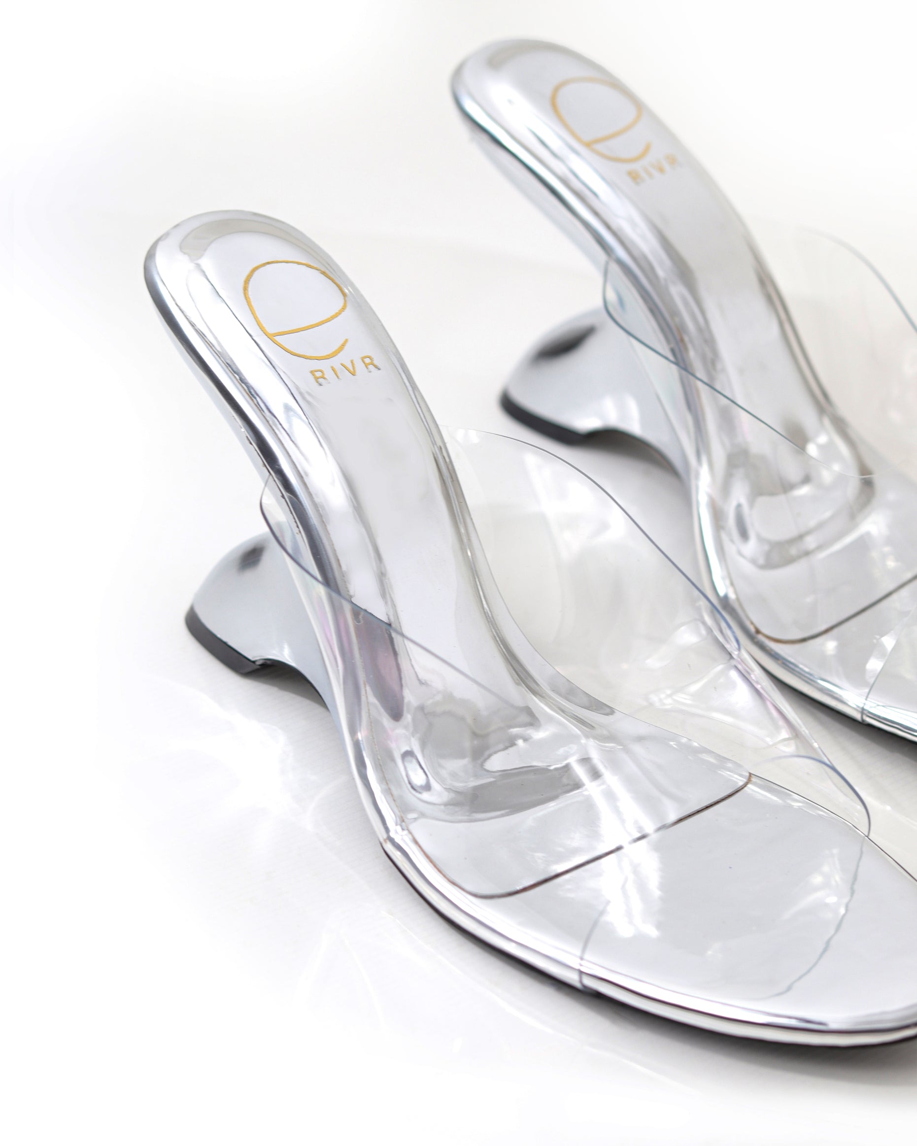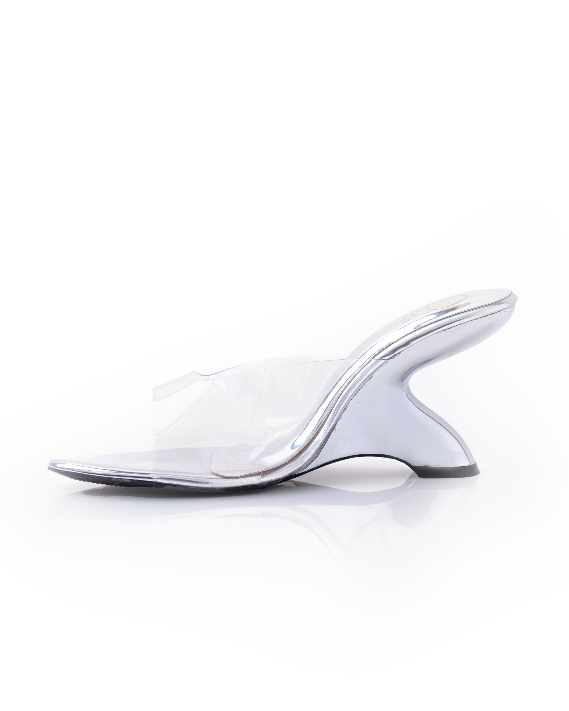 The futuristic open-toe mule with a sculptural chrome heel and a clear PVC upper, giving it a barely-there, modern glass-slipper effect. The design is bold, architectural, and effortlessly cool.