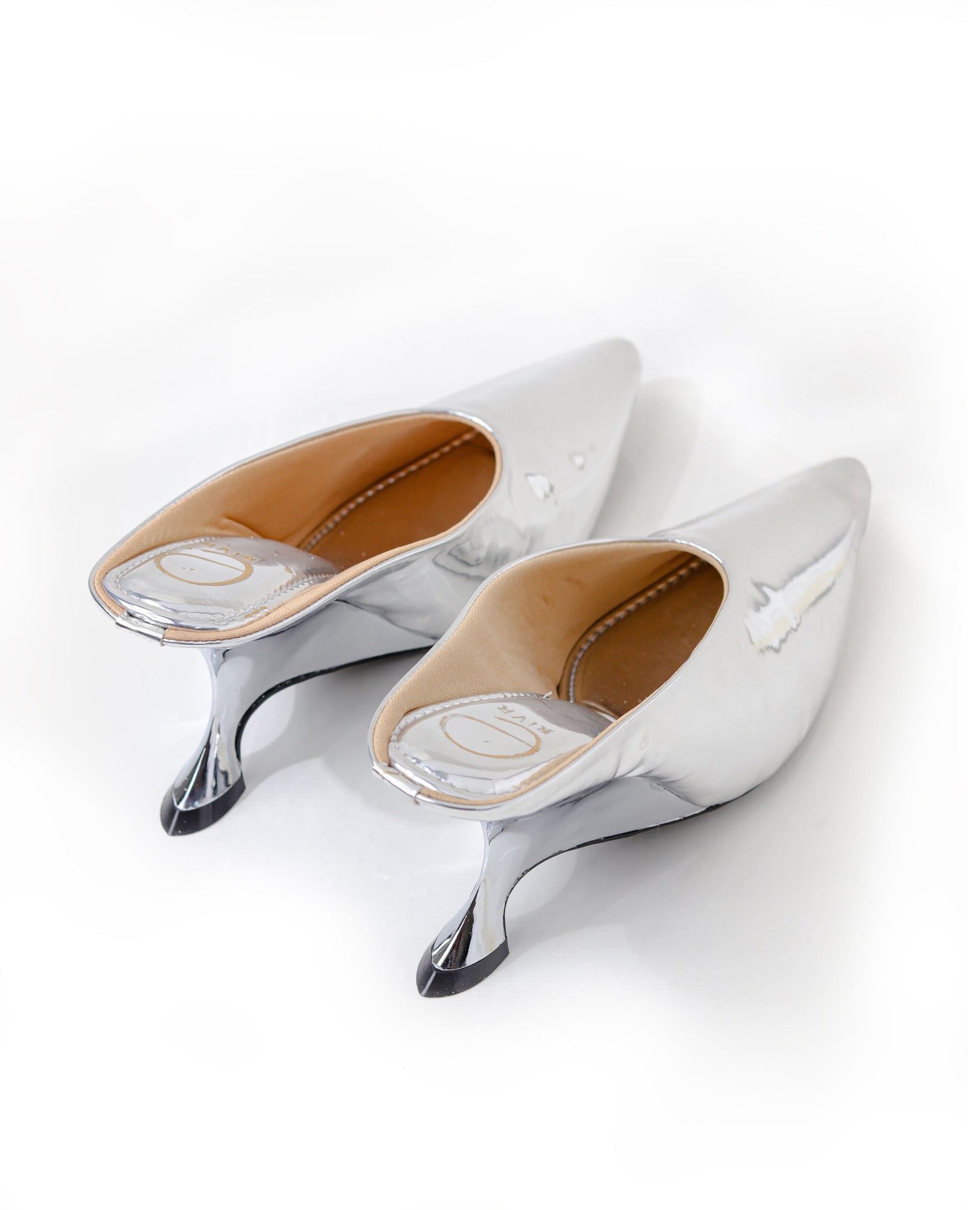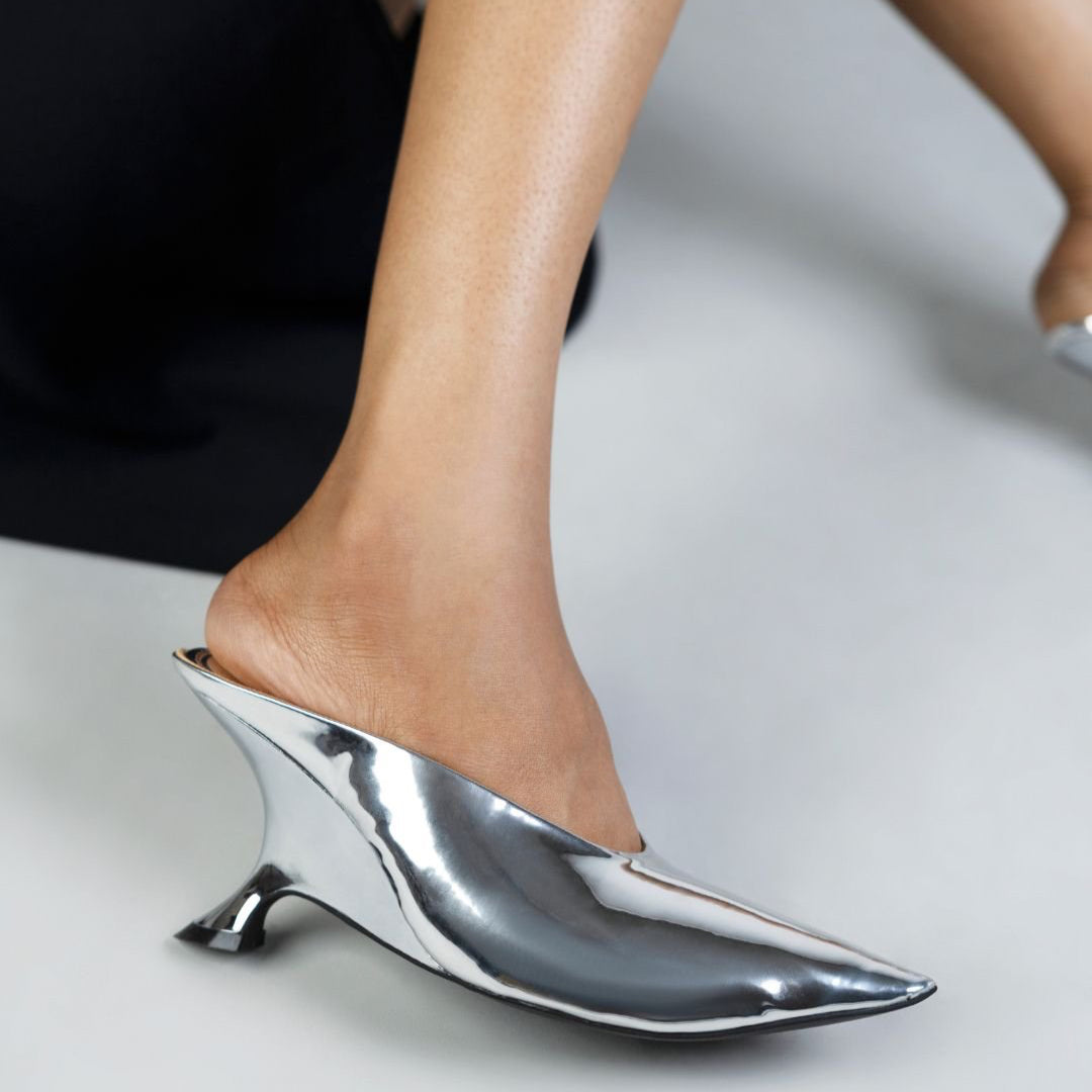 The look is modern, minimalistic, and bold—blending elegance with a fashion-forward edge. The shoe’s high-gloss chrome finish gives it a bold, avant-garde aesthetic.
