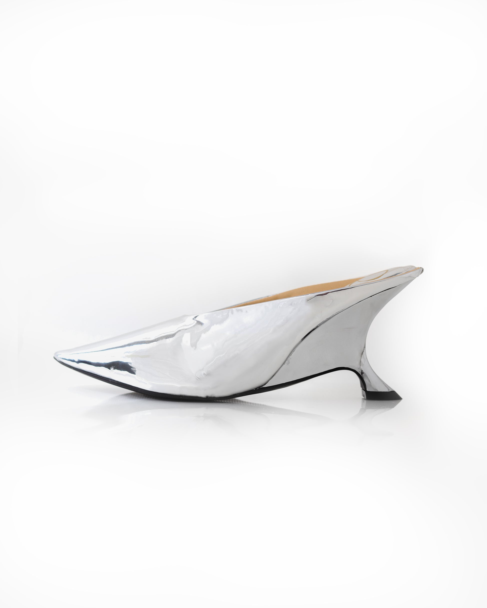 Ethereal and luminous, featuring a futuristic chrome silhouette and sculpted toe, it reflects the quiet strength and mystery of the moon.