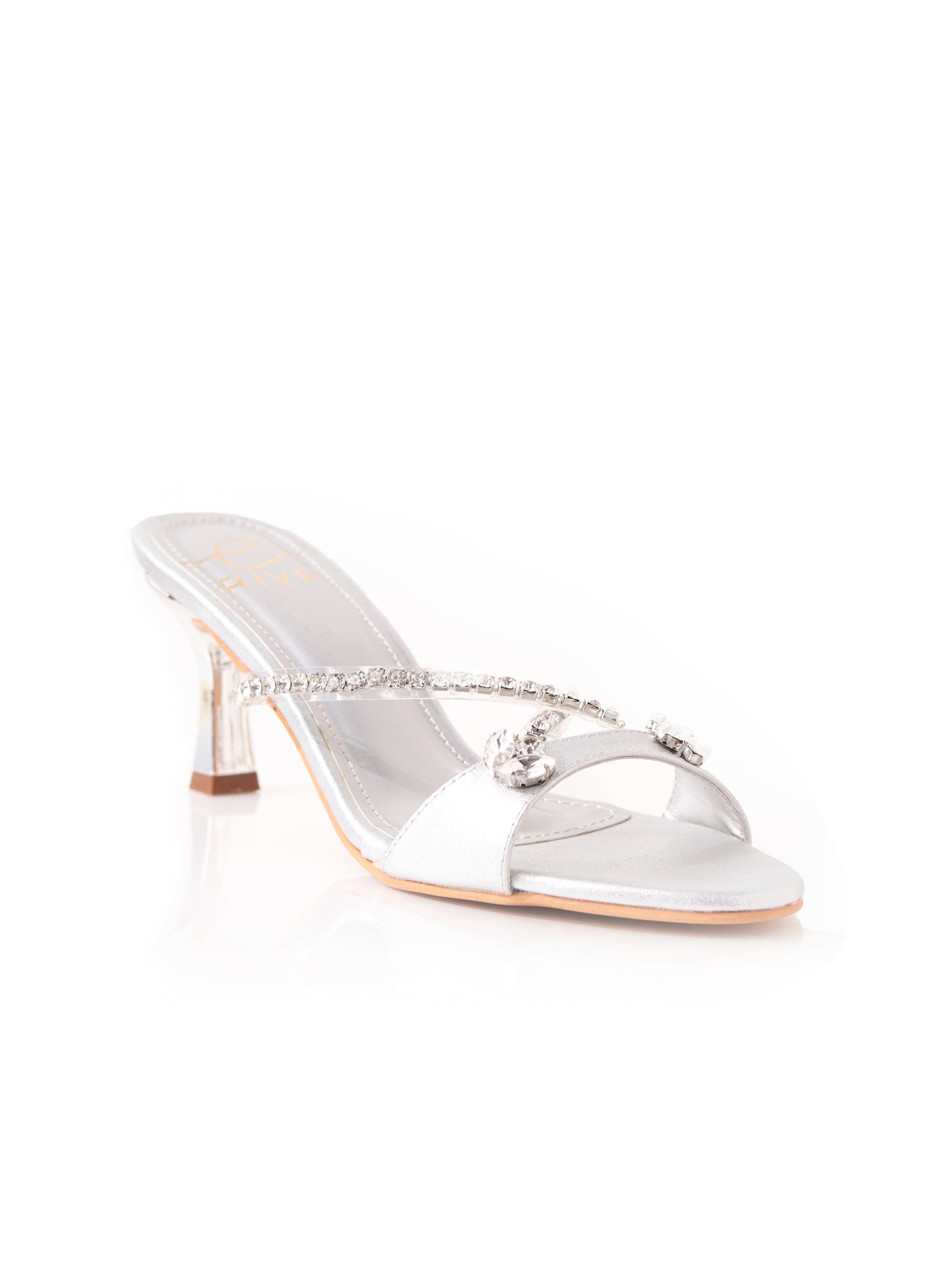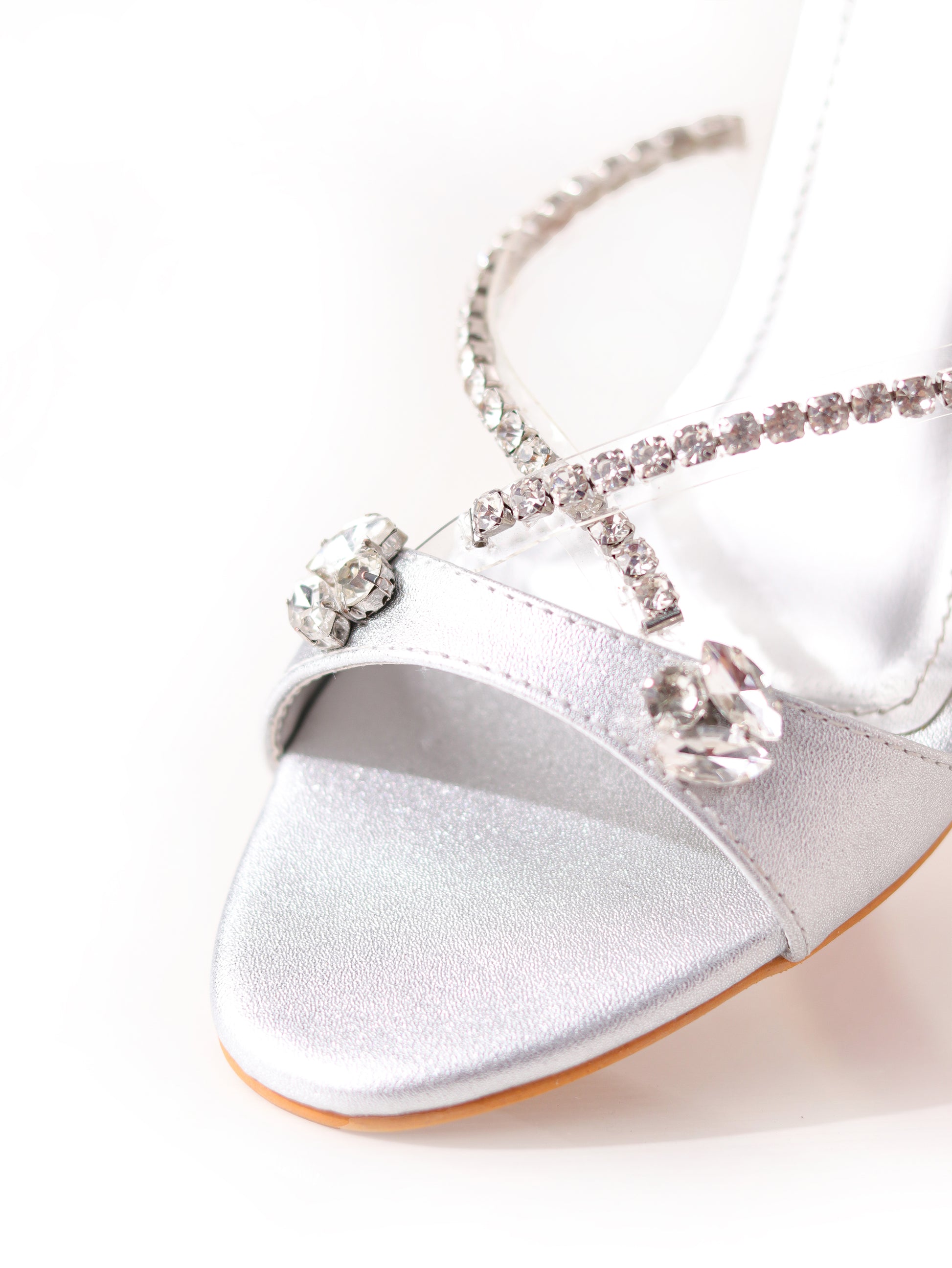 Shine bright with these sparkling PVC and metallic napa synthetic leather mule sandals!