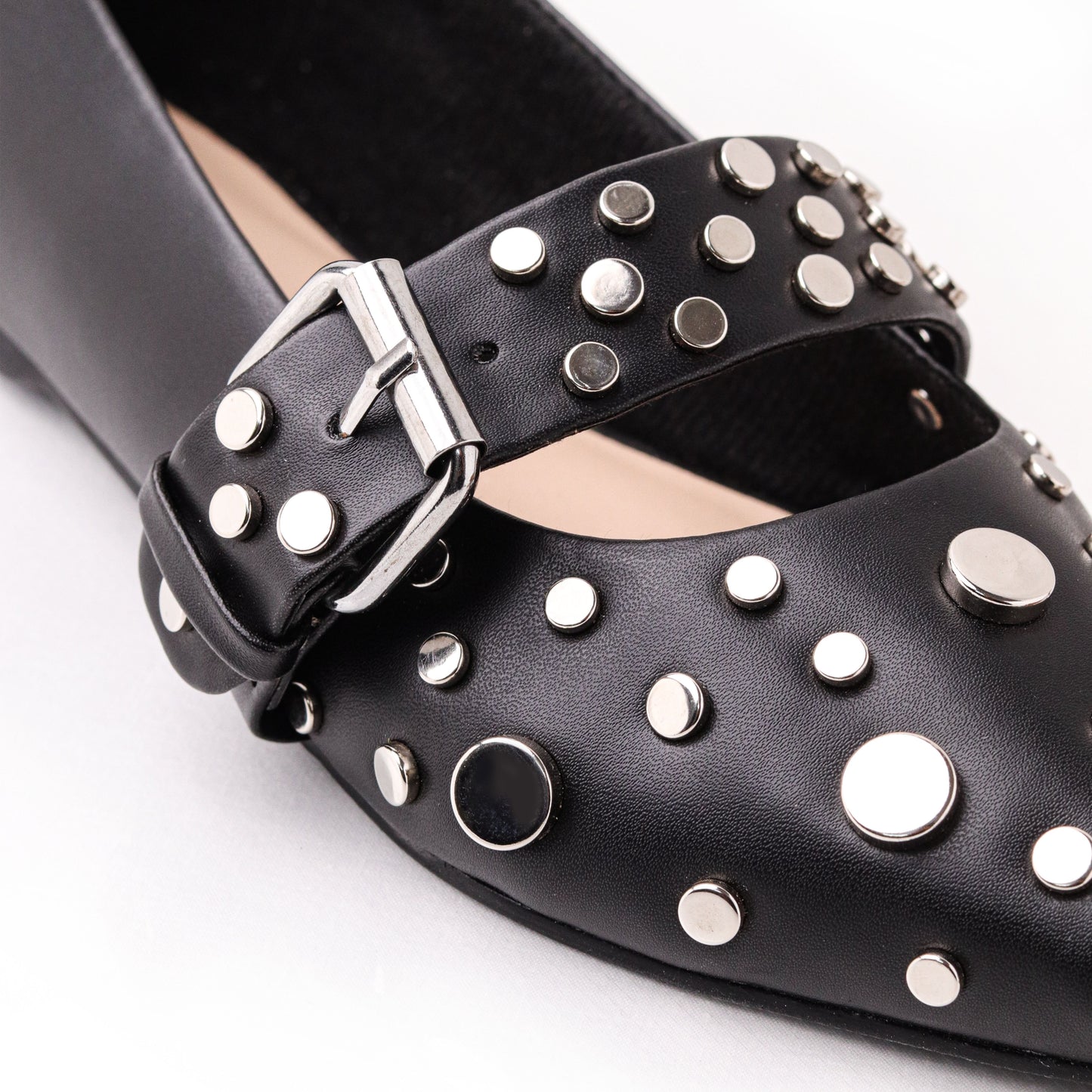 Enchant in our Studded Ballerina Flats, where classic charm meets contemporary allure. Adorned with delicate studs, these flats redefine elegance with a touch of edge. Perfect for adding a hint of glamour to any outfit, they dance with style and sophistication.