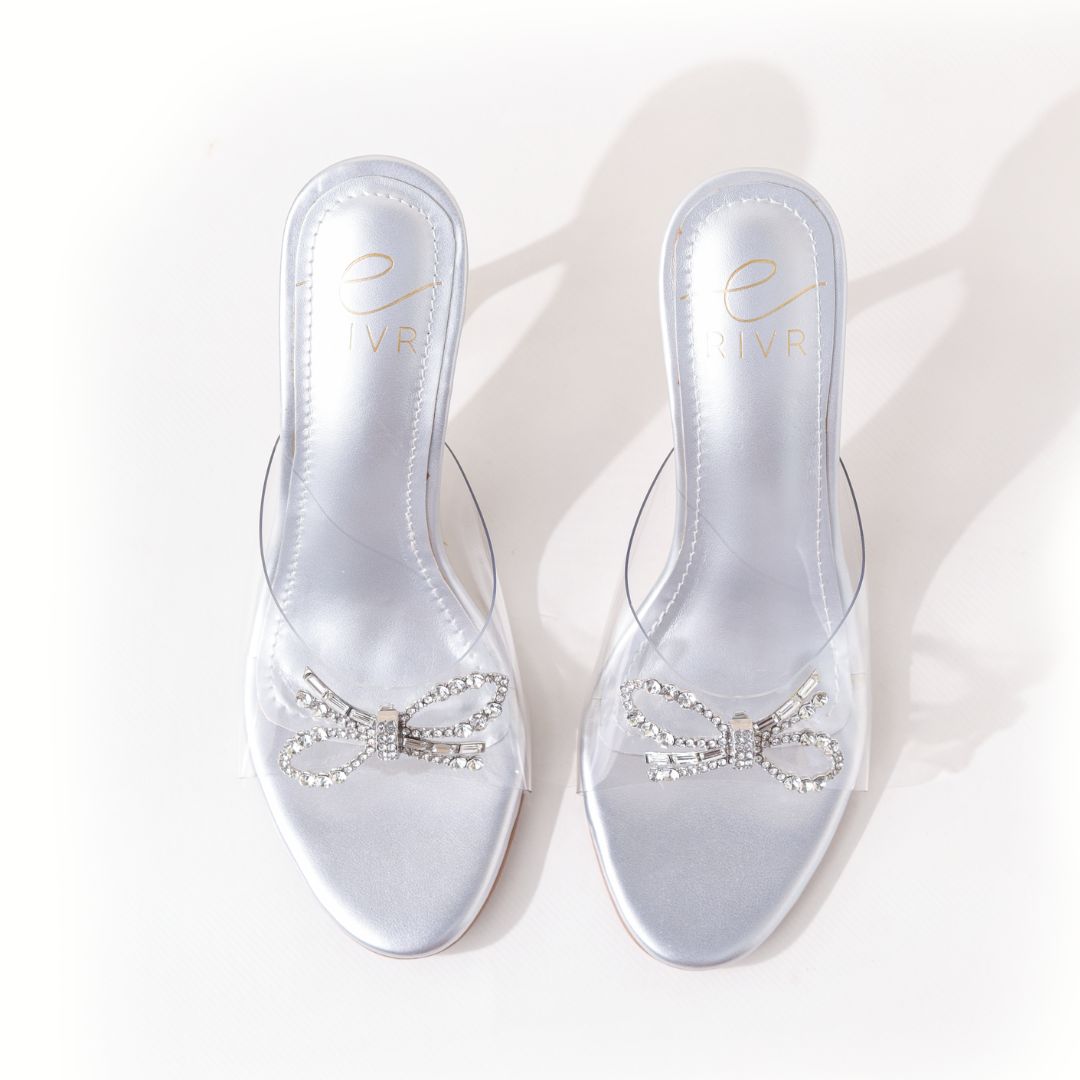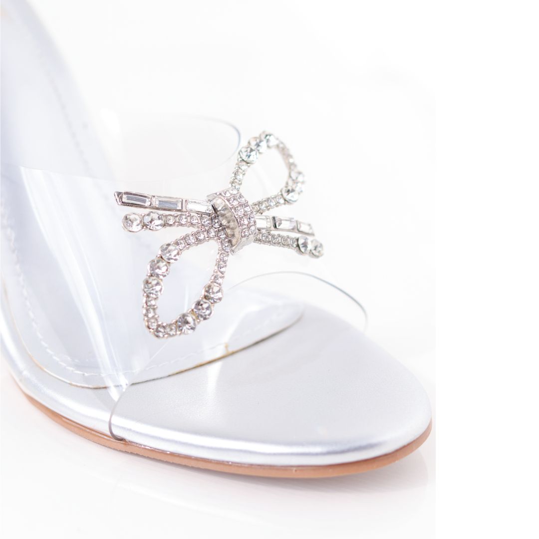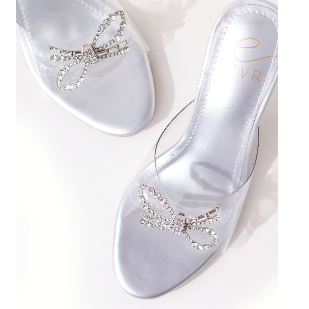Bow-Wow. Sliver shoes are having a moment, and you can embrace the trend with this chic pair. Featuring a minimalist open-toe design, with crystal bow, rest on sturdy trapeze heels with a striking matte finish that makes them stand out even more. Whether you dress them up or down, these versatile shoes will elevate your style for any occasion.